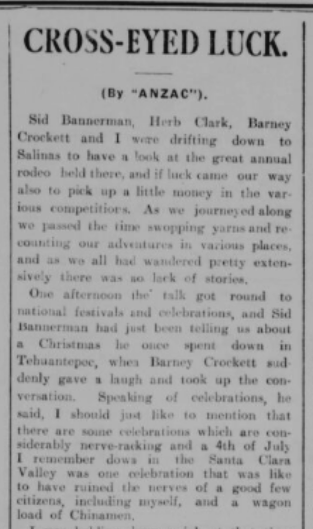 This was published in the Buchan Observer in March 1937 (under the name “Anzac”) and describes an incident that Barrowsgate was involved in when in California in 1911. He was working as a horseman for an apple grower near Castroville and one of his jobs was to transport migrant Chinese apple pickers from the orchards to the town. On one occasion, the horses bolted and Barrowsgate barely managed to control the wagon and its passengers as the horses galloped into town. The story contains what would now be regarded as racial stereotypes of Chinese people.